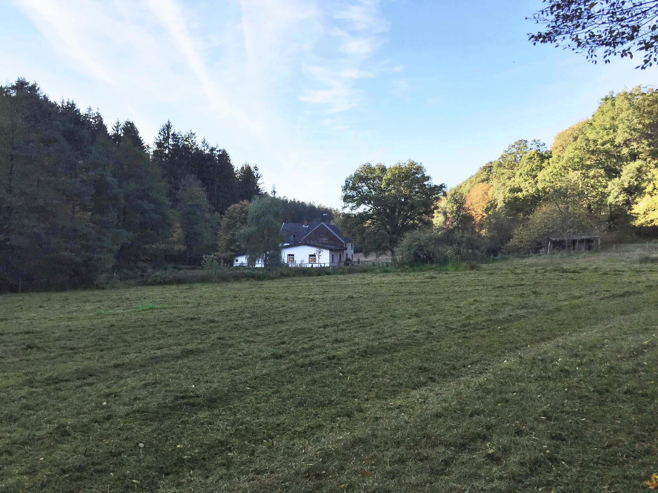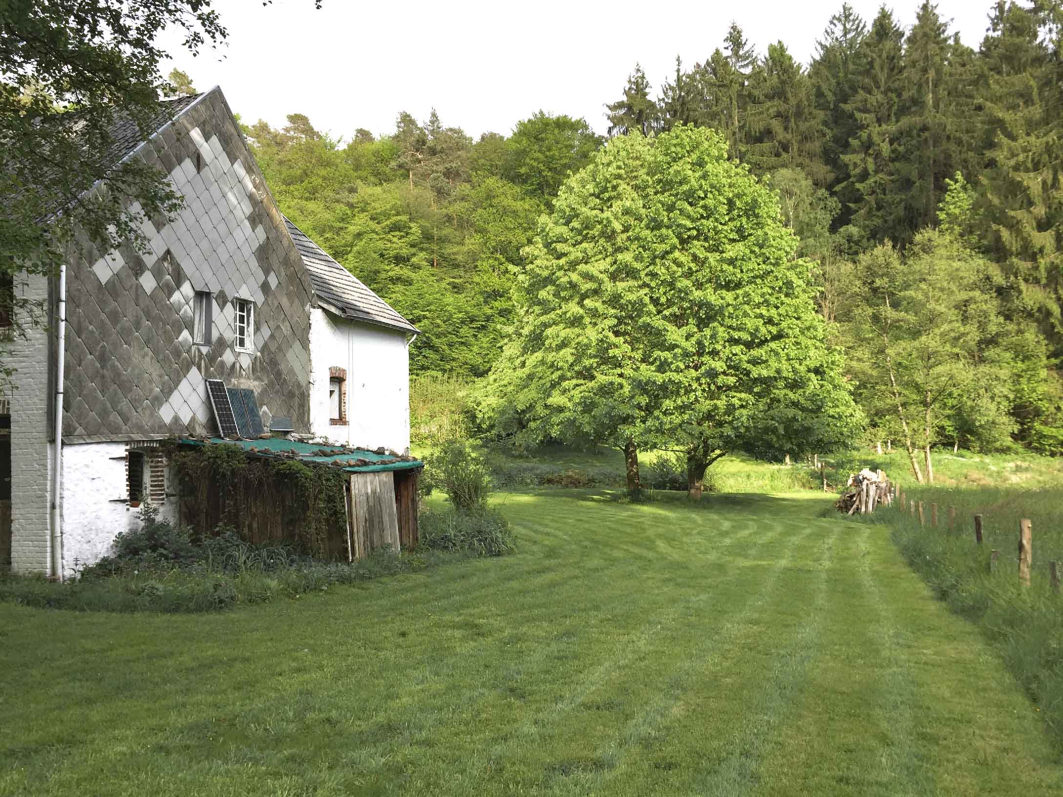 - Une ferme au milieu de la clairière/prairie entournée de bois. Elle comprend deux prairies annexes de 4 ha, qui sont classées comme réserve naturelle, un petit ruisseau et un étang. L’ancien bâtiment date du 16ième siècle et est malheureusement mal entretenu. Un des bâtiments est utilisé comme résidence de vacances. Cette partie a été rénovée et servait dans le temps comme café et guinguette pour la population locale. Par une petite promenade de 20 minutes vous arrivez au barrage de la Vesdre. La ferme est ‘’off-grid’’, l’électricité est fournie par un générateur mais la couverture réseau LTE est bonne. La ferme est facilement accessible par des chemins forestiers.