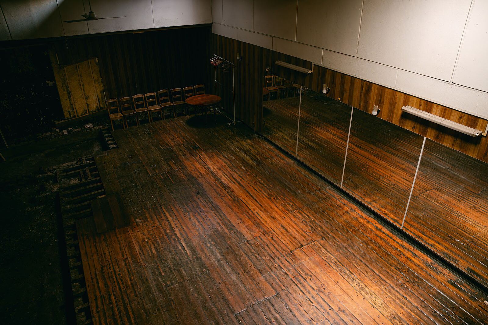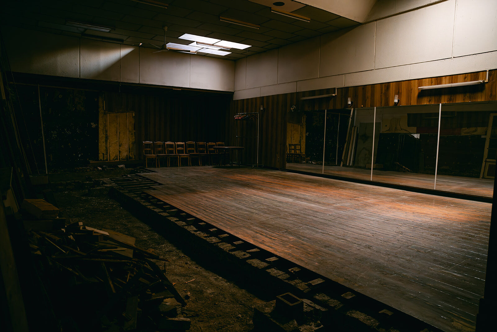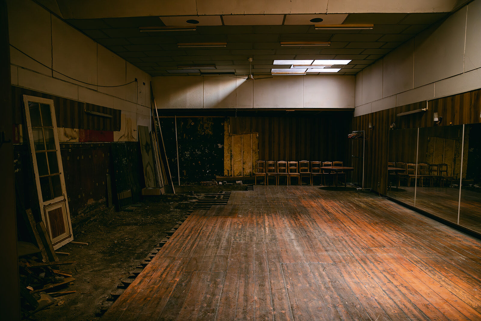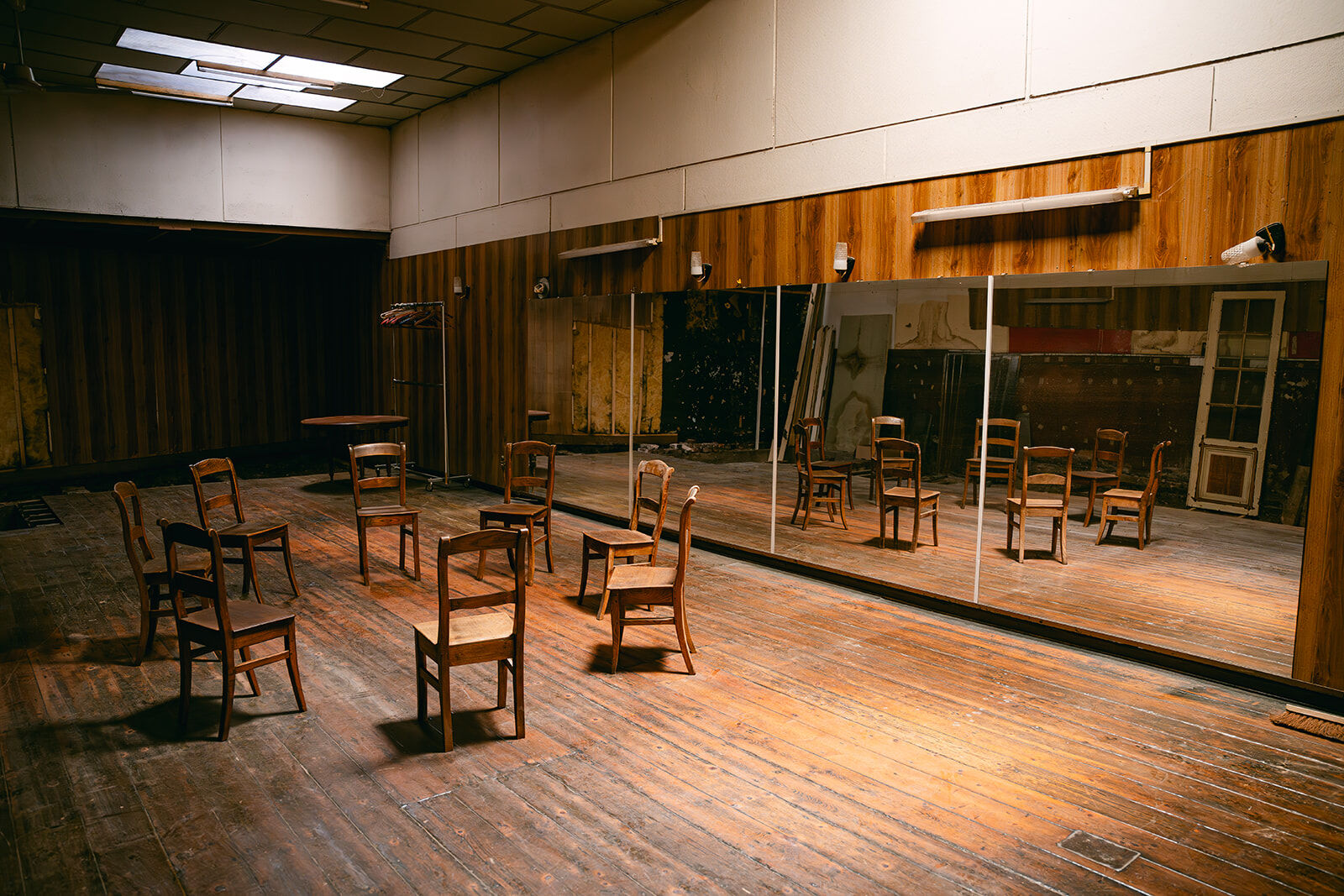 - Ancienne salle de danse de rock acrobatique et danse country. Salle chargée d'histoire, dans son jus. Anciennement bien connue dans la région. À l'arrière d'une maison de maître en rénovation. Plus en activité depuis quelques années. Grand parquet de danse avec beaucoup de cachet, couleurs chaudes et belle patine. 4 grands miroirs fixés au mur + une dizaine d'autres grands miroirs (non fixés) disponibles. Présence d'une mezzanine pour faire de prises de vue depuis un point haut (vue sur toute la salle car c'était l'ancienne loge du jury des compétitions de rock qui ont eu lieu dans cette salle pendant des décennies). Présence d'un petit bar / comptoir. Suite à des soucis d'humidité, une partie du parquet et des lambris muraux ont été arrachés (selon les angles de prises de vue, cela peut ne pas se voir). Cela confère à la salle une ambiance unique "désaffectée/délabrée" absolument originale, authentique. Possibilités de fournir des éléments de décors intéressants : miroirs, chaises en bois, grand portant droit, ventilateur, vielle table... Différents éclairages déjà possibles sur place : lumière naturelle, plafonnier (néon), appliques murales.