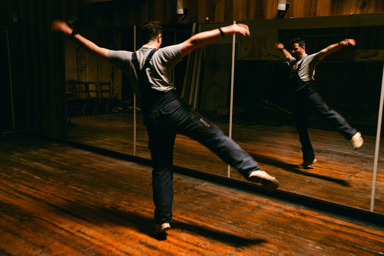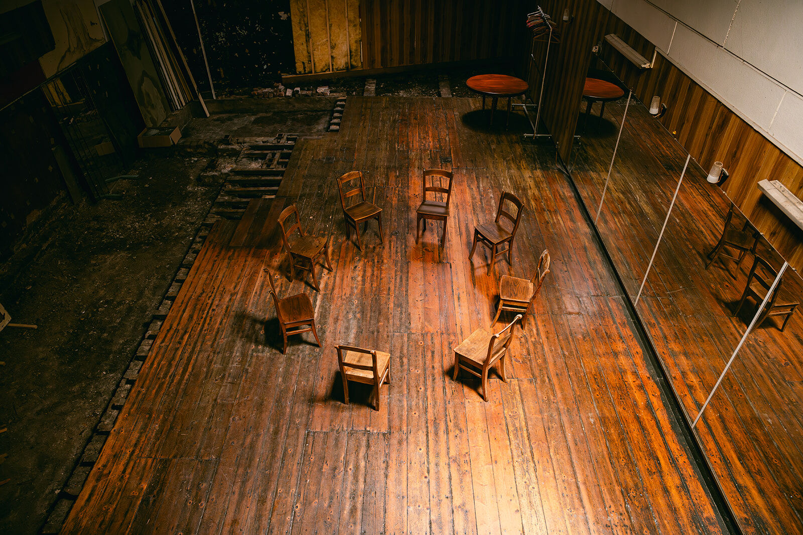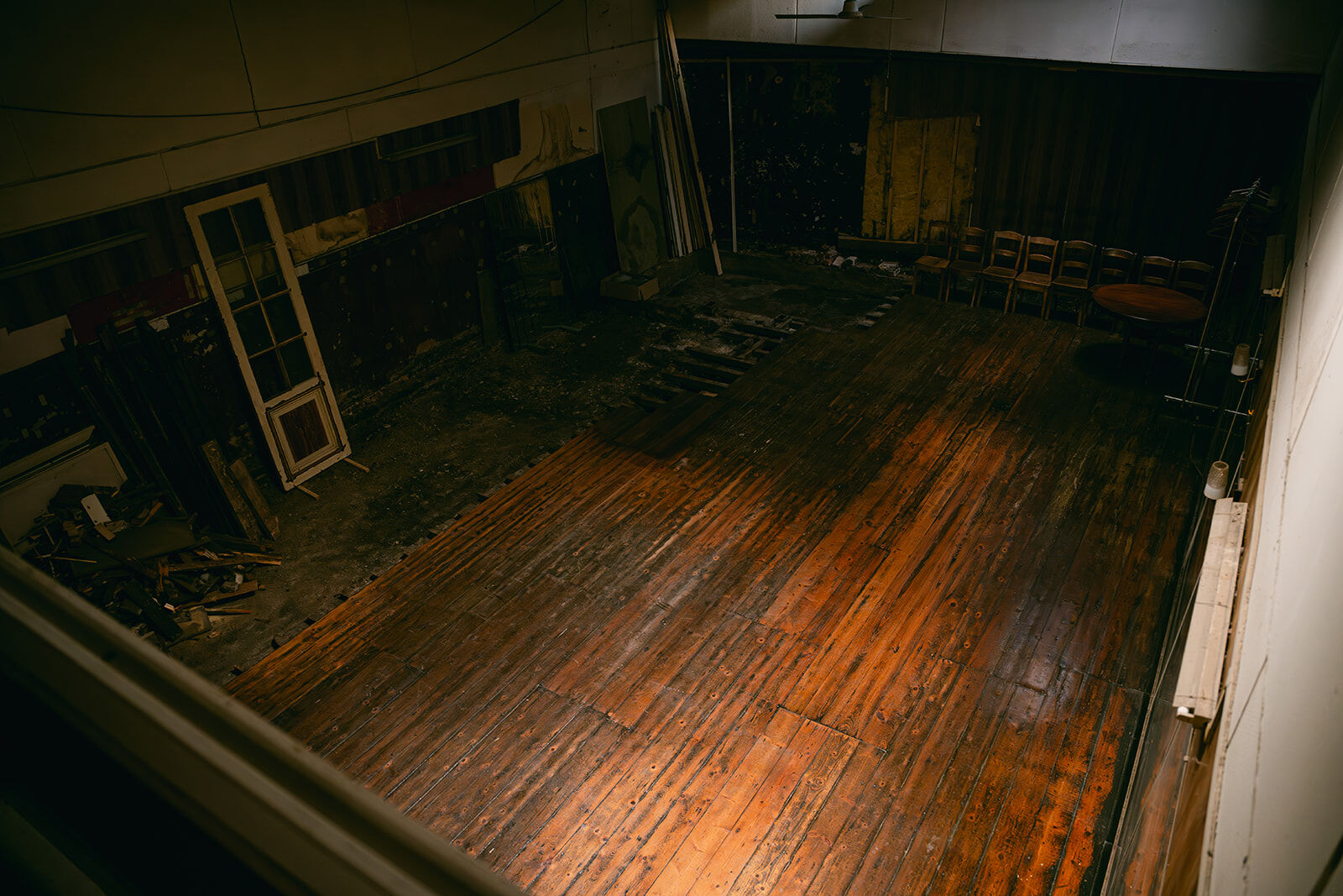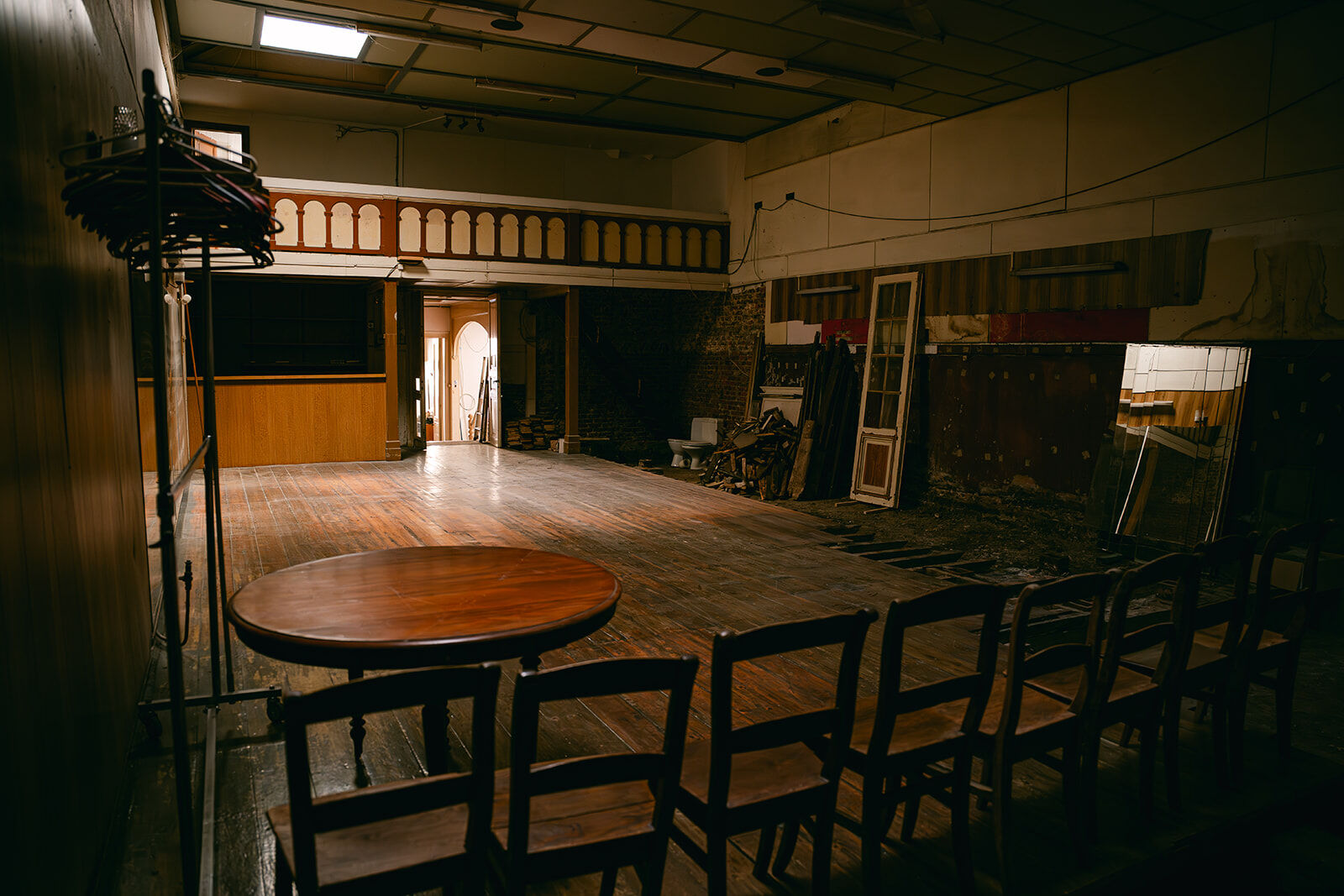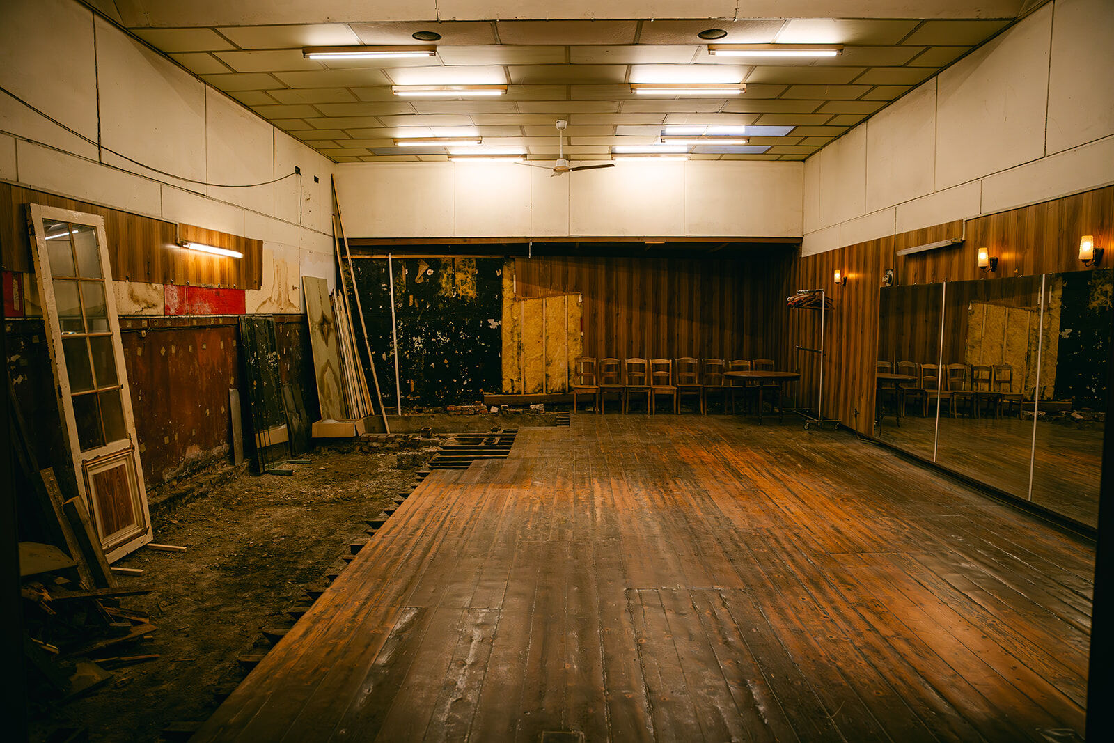 - Ancienne salle de danse de rock acrobatique et danse country. Salle chargée d'histoire, dans son jus. Anciennement bien connue dans la région. À l'arrière d'une maison de maître en rénovation. Plus en activité depuis quelques années. Grand parquet de danse avec beaucoup de cachet, couleurs chaudes et belle patine. 4 grands miroirs fixés au mur + une dizaine d'autres grands miroirs (non fixés) disponibles. Présence d'une mezzanine pour faire de prises de vue depuis un point haut (vue sur toute la salle car c'était l'ancienne loge du jury des compétitions de rock qui ont eu lieu dans cette salle pendant des décennies). Présence d'un petit bar / comptoir. Suite à des soucis d'humidité, une partie du parquet et des lambris muraux ont été arrachés (selon les angles de prises de vue, cela peut ne pas se voir). Cela confère à la salle une ambiance unique "désaffectée/délabrée" absolument originale, authentique. Possibilités de fournir des éléments de décors intéressants : miroirs, chaises en bois, grand portant droit, ventilateur, vielle table... Différents éclairages déjà possibles sur place : lumière naturelle, plafonnier (néon), appliques murales.